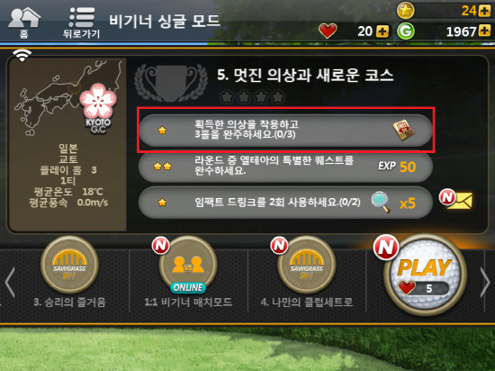 퀘스트 역시 골프를 잘 모르는 사람도 즐겁게 할 수 있도록 구성되었다. ‘버디를 2회 이상 기록하세요’등 처음 골프를 하는 사람은 와닿지 않는 퀘스트도 물론 있지만, ‘획득한 의상을 착용하고 3홀을 완주하세요’등의 가벼운 퀘스트도 있어 부담스럽지 않게 즐길 수 있다.