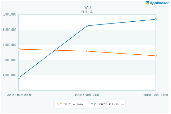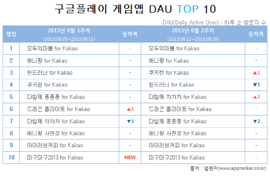 4월 3주차부터 6월 2주차까지는 ‘애니팡’, 데브시스터즈의 ‘쿠키런 for Kakao’, ‘윈드러너’가 순위를 다투고, 6월 3주차에는 CJ 넷마블의 ‘모두의 마블’이 순위권에 폭풍같이 진입해 ‘애니팡’, ‘쿠키런’과 7월 2주차까지 경쟁을 하다가 3주차에는 ‘윈드러너’가 ‘쿠키런’을 밀어내고 순위권에 접어든다.