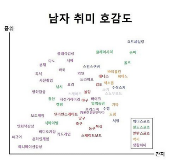 하지만 이 표에는 치명적인 허점이 있다. 간지와 품위는 다른 말로 ‘돈’과 ‘허세’로 바꿀 수 있다. 즉 취미생활을 하는데 돈이 많이 들어간다는 뜻이다. 하지만 게임의 경우 특별히 비싼 아이템을 사지 않는 경우 크게 돈이 들지 않는다.