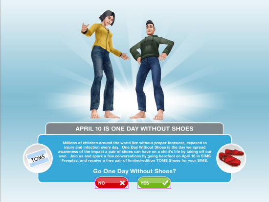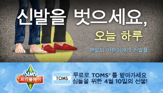 올해 다섯 번째를 맞이하는 TOMS의 ‘신발 없는 하루’ 캠페인에 EA모바일이 함께한다. ‘심즈 프리플레이’의 심들은 4월 10일 AM 12:00, 전 세계적으로 펼쳐지는 TOMS의 ‘신발 없는 하루’ 행사에 발 맞춰 하루 동안 맨발로 생활하게 된다. 심들이 신발을 벗어 달라는 게임 속 메시지를 찾아 승낙하면, 친구들과 함께 흥겨운 맨발 댄스 파티를 열거나 옥수수를 재배하는 등 신발 없이 모든 생활을 하게 된다. 신발을 벗어 달라는 요청을 받아들이고 난 24시간 후에는 심들이 신을 수 있는 가상의 TOMS 신발을 선물로 받을 수 있다.