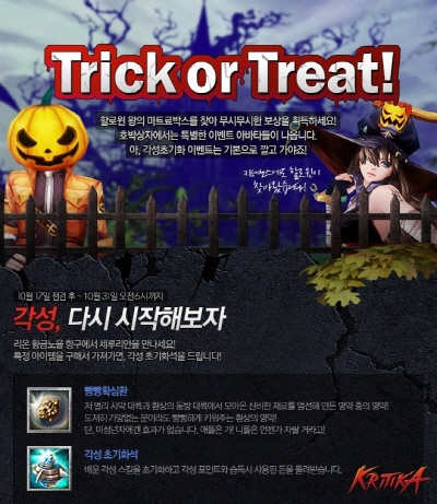 24일부터 오는 11월 7일까지는 할로윈 데이 전용 아바타를 획득할 수 있는 'TRICK or TREAT!' 이벤트가 진행된다. 보스 몬스터를 사냥하면 머리에 착용할 수 있는 익살스러운 표정의 호박 투구 5종과 캐릭터 별로 각기 다른 개성 넘치는 할로윈 무기를 획득할 수 있다.