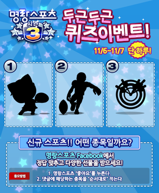 금번에 진행되는 퀴즈 이벤트는 11월 8일에 새롭게 선보일 ‘명랑스포츠 시즌3’의 신규 종목들에 대한 유저들의 궁금증을 해소하기 위해 기획되었다. 이번 이벤트는 ‘명랑스포츠’ 공식 페이스북 페이지(https://www.facebook.com/MRsports)를 통해서 진행되며, 이벤트에 참여하면 스타벅스 커피 기프티콘과 각종 아이템을 선물 받을 수 있다. 시즌 2에 진행되었던 퀴즈 이벤트보다 한층 더 ‘업그레이드’ 된 셈이다.