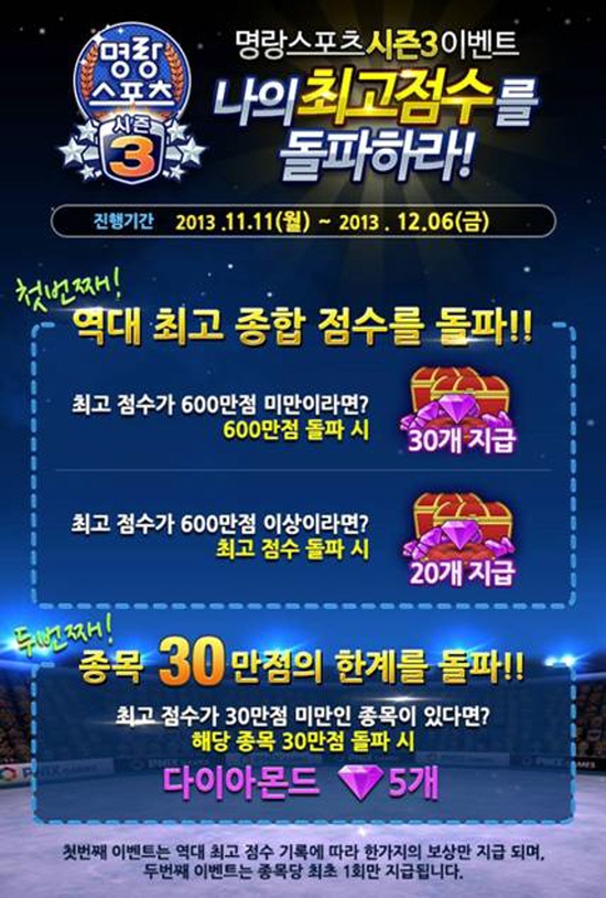 피닉스게임즈는 금일(11월 11일)부터 “명랑스포츠 for Kakao(이하 ‘명랑스포츠’)” 시즌 3 출시를 기념한 전격 기록갱신 이벤트를 진행한다고 밝혔다.