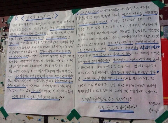 이 짧은 말 한마디는 수많은 사람들의 마음을 흔들었다. 고려대학교에서 시작한 ‘안녕들하십니까’ 벽보 열풍은 전국 67개 대학교를 비롯해 고등학교까지 번졌다. 이런 거센 분위기가 의미있는 이유는 사람들이 자신의 목소리를 내기 시작했다는 것이다.