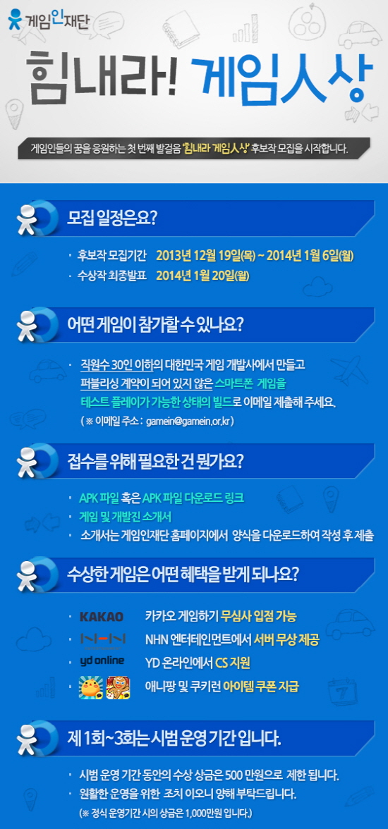 재단법인 게임인재단(이사장 남궁훈, www.gamein.or.kr)은 금일 19일부터 내달 6일까지 대한민국 중소 모바일 게임 개발사 지원을 위한 ‘힘내라, 게임인상’ 공모를 진행한다.