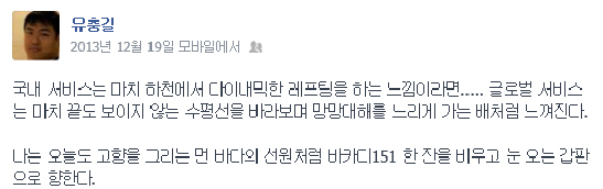 유충길 대표는 페이스북에 “국내 서비스는 마치 하천에서 다이내믹한 레프팅을 하는 느낌이라면, 글로벌 서비스는 마치 끝도 보이지 않는 수평선을 바라보며 망망대해를 느리게 가는 배처럼 느껴진다”고 이야기하기도 했다.