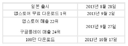 성과도 훌륭하다. 2013년 8월 28일 일본에서 라인 플랫폼 없이 맨몸으로 시작해 5일만에 앱스토어 무료 다운로드 부문 1위를 차지했다. 이 기세를 몰아 9월 27일에는 앱스토어 매출 순위 22위, 구글 매출 순위 24위를 기록했다. 그리고 출시 51일 만인 10월 17일에는 무려 100만 다운로드를 돌파했다.