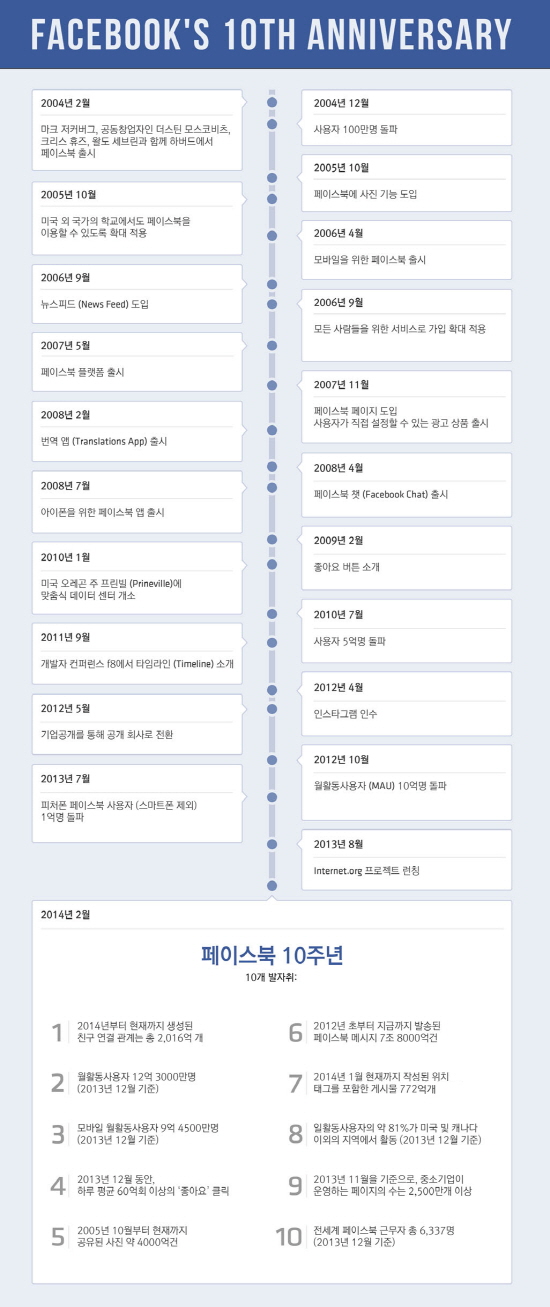 인포그래픽에는 소규모 학교 네트워크로 시작한 페이스북이 전 세계 모든 사람들이 가입할 수 있도록 확대된 2006년 9월, 많은 이들에게 사랑 받는 ‘좋아요 버튼’ 처음 등장한 2009년 2월 등, 중요했던 순간들을 타임라인 형태로 한눈에 확인할 수 있다.