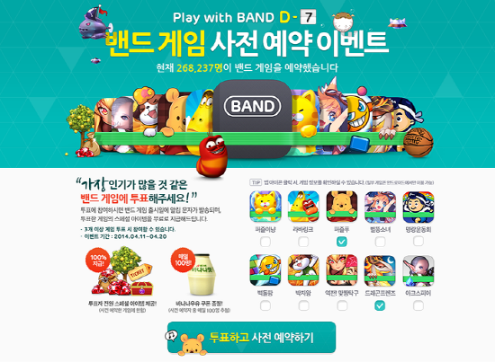 캠프모바일은 지난 11일 '밴드 게임'의 론칭을 열흘 앞두고, 1차로 참여하는 게임 10종을 공개하면서, 사전 예약 이벤트( www.band.us/event ) 를 시작한 바 있다.