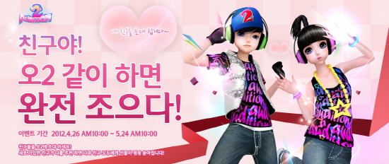 26일부터 5월 24일까지 진행되는 ‘친구야, 오디션2 같이 하면 완전 조으다’ 이벤트는 '오디션2'에 신규 가입한 고객이 추천인을 등록하면 일정 레벨 달성마다 가입자와 추천인 모두에게 선물을 지급하는 내용이다.