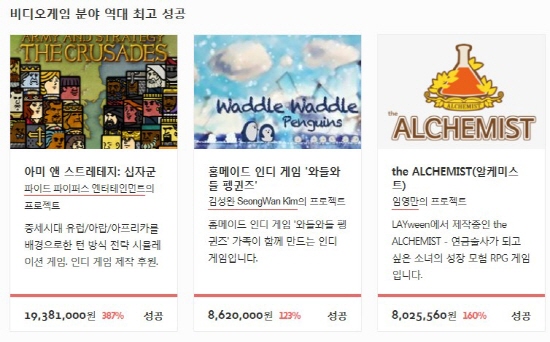 현재 한국 크라우드펀딩 사이트 중에서 게임 분야가 가장 활성화된 곳은 텀블벅이다. 텀블벅이 딱히 게임에 유리한 조건이 있었던 것은 아니지만 여기서 첫 성공 사례들이 연이어 터지면서 선점 효과를 누리고 있다고 할 수 있다.