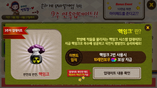 이후에도 9주간의 연속 업데이트 이벤트를 확인하기만 해도 보상 획득 및 경품 응모가 가능하며, 5월 29일까지 연승 이벤트를 진행하여 매주 10연승을 달성하게 되면 추첨을 통해 아이패드 미니를 경품으로 증정하여 많은 유저들이 성황리에 참여하고 있다. 또한 오픈 이후 안정적인 서비스 운영으로 사용자에게 호평을 받고 있으며 이에 보답하기 위해 지속적으로 이벤트 진행 및 컨텐츠 업데이트를 준비하고 있다.