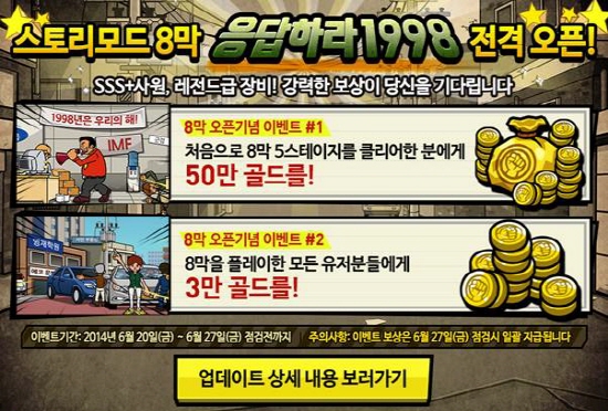 '무한상사'는 기존 7막까지 있던 스토리모드에서 제 8막 “응답하라 1998” 스테이지를 추가 하였고, 8막 오픈 기념으로 8막에 진입한 유저 전원에게 3만 골드를 제공하며, 최초로 8-5 스테이지를 클리어한 유저를 대상으로 50만 골드를 지급하는 파격적인 이벤트를 오는 27일까지 진행한다.