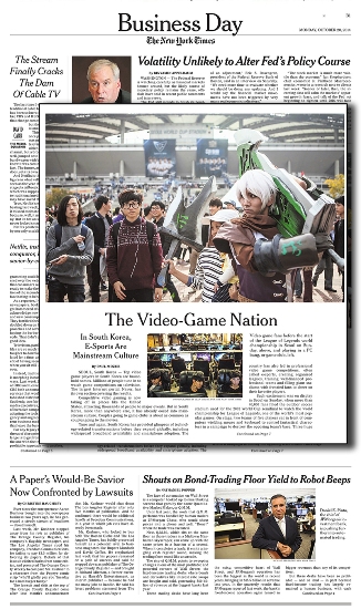 지난 20일, 미국의 유력지 뉴욕타임스는 한국의 e스포츠의 역사와 열기에 대해 자세한 내용을 다룬 기사를 B섹션 1면을 통해 소개했다.