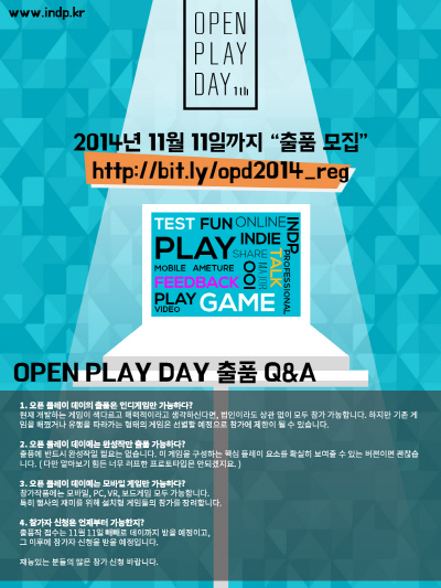 2015년 이끌 인디 게임 발굴의 큰 판이 열린다. 유망한 한국 인디게임을 전시하는 행사 오픈플레이데이(Open Play Day)가 12월 4일 코엑스그랜드볼룸에서 열린다.
