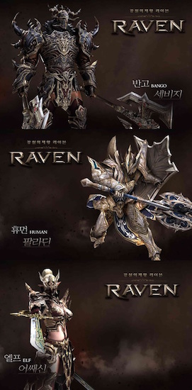 이번에 공개한 ‘레이븐’의 3종 캐릭터는 공격과 방어 능력을 고르게 갖춘 ‘휴먼’, 빠른 공격 속도가 일품인 ‘엘프’, 공격에 특화된 ‘반고’ 등 3종이며, 각 캐릭터는 이용자가 수집해 장착하는 장비 세트에 따라 색다른 콘셉트의 5가지 클래스로 다시 나눠지는 것이 특징이다.