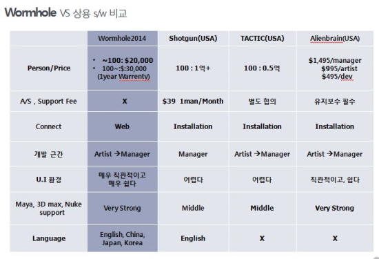 “글로벌 1위 샷건은 매년/100명 기준 1억원의 비싼 사용료 지불하고 그래픽 작업자가 사용하기 어렵다. 이에 비해 웜홀은 3000만원대로 매우 공격적인 가격과 매우 사용하기 쉽다. 그리고 유일하게 언어도 영어 이외 중국어 , 한국어 버전이 있다. 정부의 지원에서 개발한 공정관리 솔루션로 공증되었으니 의무적으로 구축해주면 해외 시장을 적극공략 할 공격적인 마켓팅 프로그램으로 만들 수 있을 것 같다.”
