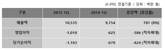이스트소프트(대표 김장중)는 12일 잠정실적 공시를 통해, K-IFRS 연결재무제표 기준 2015년도 1분기 매출 105.3억 원, 영업이익 -10.1억 원을 기록했다고 밝혔다.