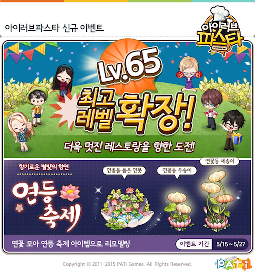 ㈜파티게임즈(대표 이대형, KOSDAQ 194510)는 자사가 개발하고 서비스하는 인기 레스토랑 경영 SNG ‘아이러브파스타 for Kakao’가 최고레벨을 65레벨까지 확장하고 연등 축제 등 다양한 이벤트를 실시한다고 금일(15일) 밝혔다.