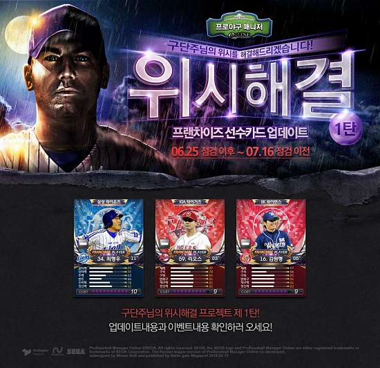 두 번째로 위시해결 1탄 이벤트가 7월 16일까지 진행된다. 이 기간 게이머는 15일만 온라인뿐 아니라 프로야구 매니저 모바일 어플에 접속해도 모든 보상 아이템을 획득하게 되며, 이사회 가입, 이사회 연고지 쟁탈전 10회 참여 등 4가지 미션을 완료하면 보상이 주어지는 이벤트에도 참여할 수 있다.