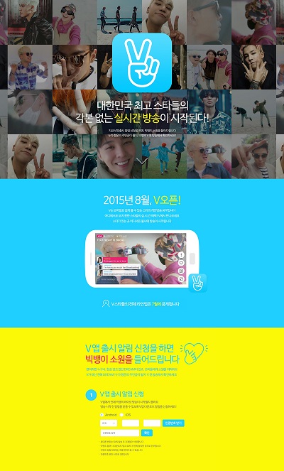 네이버는 6월 30일부터 서비스 출시 전까지 ‘브이앱 출시 알림’ 이벤트를 진행한다. 알람을 받고 싶은 이용자는 이벤트 페이지(https://campaign.naver.com/v) 에서 신청하면 된다. 이용자가 스타의 V 첫 방송에서 보고 싶은 모습에 관한 의견을 남기면 스타가 이를 채택해 반영할 예정이다. 'V(브이)’ 서비스에 참여하는 스타들의 라인업은 7월 한 달 동안 공개된다.