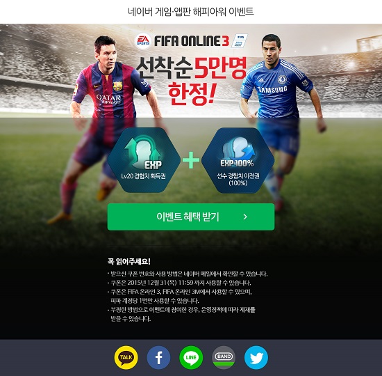 네이버는 게임 아이템을 한정된 시간동안 특별 제공하는 ‘해피아워’ 이벤트를 게임•앱 주제판에서 진행, 게임정보 외에도 다양한 즐거움을 전달할 계획이다. 그 첫번째로 15일 오전 11시부터 선착순 5만 명에게 ‘피파온라인3’ 에서 유용하게 활용할 수 있는 ‘LV20 경험치 획득권’, ‘선수 경험치 이전권 100%’ 등 아이템을 증정한다. ‘해피아워’ 이벤트는 비정기적으로 게임•앱 주제판에서 깜짝 진행될 예정이다.