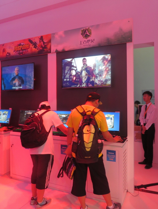 B2C에서 한국 게임을 만나기는 쉽기 않았다. 우선 온라인게임은 중국 최대 텐센트 부스 안 전시 중인 엔씨소프트의 ‘MXM’과 엑스엘게임즈의 ‘아키에이지’도 눈에 잘 안띄는 자리에서 시연을 했다. 그리고 공중망에서 전시된 엔씨소프트의 ‘길드워2’가 있었다.