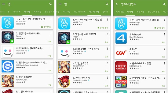 V는 한국, 일본, 홍콩, 인도네시아, 말레이시아, 필리핀을 비롯한 아시아 국가뿐만 아니라 미국, 멕시코, 콜롬비아, 페루, 브라질 등 미주 지역, 영국, 프랑스, 독일, 스페인 이탈리아 등 유럽 지역, 이란, 카자흐스탄 등 중동지역에 이르기까지 한국 외 국가가 전체 다운로드의 약 50%를 차지하고 있습니다.