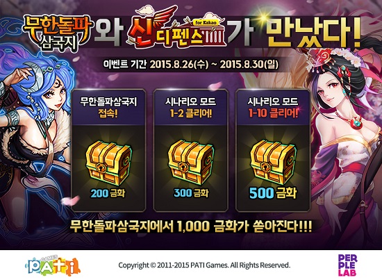 30일까지 진행되는 이번 콜라보 이벤트를 통해 파티게임즈는 ‘신디펜스’를 설치하고 총 3단계로 구성된 미션을 달성하는 ‘무한돌파삼국지 for Kakao’ 유저 전원에게 여의주(캐시)를 최대 100개 지급한다. 엔쓰리게임 측은 파티게임즈의 ‘무한돌파삼국지 for Kakao’를 설치하고 미션을 달성한 ‘신디펜스’ 유저에게 금화 최대 1000개를 100% 지급한다.