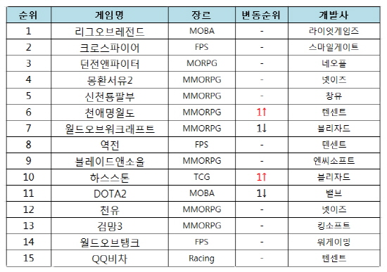 엔씨소프트의 MMORPG ‘블레이드앤소울’은 9위에 올랐다. 올해 상반기까지만 해도 ‘월드오브워크래프트’를 제치며 5위권을 유지했으나, 최근에는 인기가 주춤하는 모양새다. 한국의 ‘크로스파이어’와 ‘던전앤파이터’, ‘블레이드앤소울’은 모두 중국의 텐센트가 퍼블리싱을 맡고 있다.