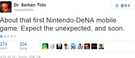 칸탄 게임즈의 CEO이자 모바일 게임 컨설턴트인 세르칸 토토가 닌텐도의 신작 게임 정보를 언급해 화제다. 토토는 3일 닌텐도와 DeNA의 첫번째 합작 모바일 게임에 대해 “예상치 못한 것을 기대하라, 곧 나온다”는 말을 트위터에 남겼다.