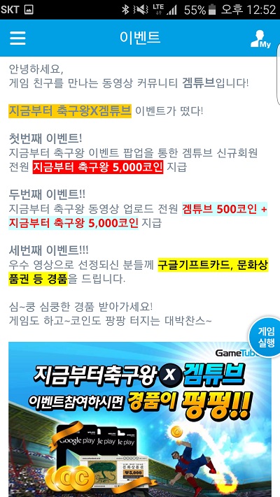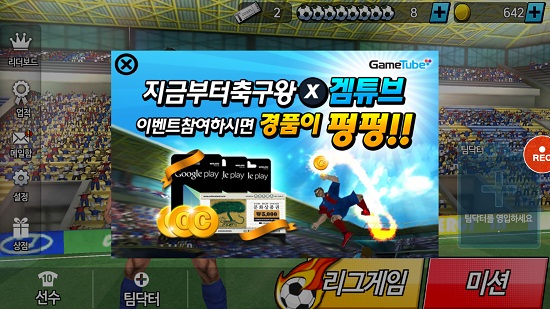 ‘지금부터 축구왕’ 게임내 팝업을 통해 겜튜브 신규회원 가입시 ‘지금부터 축구왕’ 5,000코인을 지급하고, 겜튜브에 ‘지금부터 축구왕’ 동영상을 업로드하면 겜튜브 500코인과 ‘지금부터 축구왕’ 5,000코인을 전원 지급한다. 또 우수영상을 선정해 구글기프트카드와 문화상품권 등 푸짐한 경품도 지급한다.