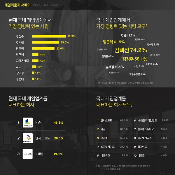 이번 블라인드의 서베이 조사 결과에 따르면 ‘현재 게임업계에 가장 영향력 있는 사람’으로 가장 먼저 떠오르는 사람(최초 상기 브랜드)은 김정주(32.3%, NXC대표), 김택진(29%, 엔씨소프트 대표), 방준혁(22.6%, 넷마블 이사회의장) 순으로 세 사람에게 압도적인 응답이 몰렸다. 그 뒤론 박근혜(4.8%), 없음/지금은 없음(4.8%), 서민(3.2%, 넥슨 전 대표) 등이 뒤를 이었다.