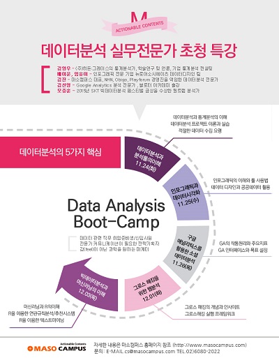 데이터분석의 큰 그림을 파악할 절호의 기회인 데이터분석 부트캠프에 대한 보다 자세한 내용은 마소캠퍼스 홈페이지(http://www.masocampus.com) 및 고객센터(02-6080-2022)로 문의하면 된다.