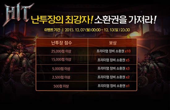 ㈜넥슨(대표 박지원)은 초대형 모바일 RPG ‘HIT(히트)’에서 ‘난투장’ 최강자들에게 장비 소환권을 선물하는 이벤트를 실시한다고 8일 밝혔다.