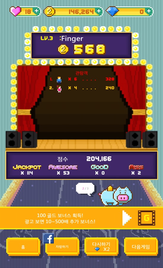 판정은 잭팟(Jackpot), 어썸(Awesome), 굿(Good), 미스(Miss) 4종으로 나뉜다. 안드로이드 특성상 터치 인식이 모바일기기마다 천차만별인 탓에 유저들의 스트레스가 심하지 않을까 다소 걱정했는데, 생각보다 판정이 너그러운 편이라 한 시름 놨다. 아마 이 부분을 해결하기 위해 심혈을 기울였을 것 같다. 완전히 놓치는 미스가 아닌 이상 콤보로 인정한다.