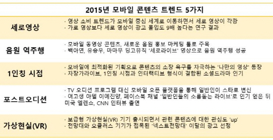 모바일 사용이 늘면서 개인의 매체이용 행태의 키워드는 ‘개인화’와 ‘이동화’다. 전통적인 매체에서와 다른, 모바일에 적합한 콘텐츠에 대한 수요도 점차 커지고 있다. 특히 올해는 동영상 콘텐츠 소비가 급격히 증가해 가히 올 한해 다양한 트렌드를 이끌어낸 주역으로 부상했다.