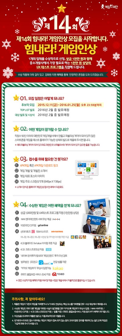 <제14회 힘내라! 게임人상>에 대한 보다 자세한 내용은 게임인재단 홈페이지(www.gamein.or.kr) 와 공식 페이스북(https://www.facebook.com/gamein.or.kr?fref=ts)을 통해 확인할 수 있다.