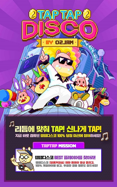 ‘탭탭디스코 by O2Jam’은 모바일 최초 레트로(Retro, 복고풍) 스타일의 리듬 액션 게임으로, 남녀노소 누구에게나 익숙한 고전적 도트 그래픽을 활용해 친숙한 느낌을 주는 것이 특징이다.