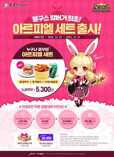 ㈜넥슨(대표 박지원)은 주먹밥 프랜차이즈 전문점 봉구스밥버거(대표 오봉구)와 제휴를 맺고 시공초월 학원 RPG '아르피엘'과 콜라보레이션 이벤트를 실시한다. 이번 제휴를 통해 이달 31일까지, 전국 9백여 개 '봉구스밥버거' 매장에서는 인기메뉴 '햄 밥버거'와 '컵 떡볶이'로 구성된 '아르피엘 세트 메뉴'가 할인가격에 판매된다. 구매고객 전원에게는 '아르피엘'에서 사용 가능한 '밥버거(10개)' 아이템 쿠폰을 증정하며, 내년 1월 31일까지 쿠폰을 등록한 유저들 중 100명을 추첨해 넥슨캐시 5만 원을 선물한다. '밥버거' 아이템은 게임 캐릭터의 체력 및 마나를 올려주는 '음식'을 제조할 수 있는 재료로, 내년 2월 15일에 게임 내 일괄 지급된다.
