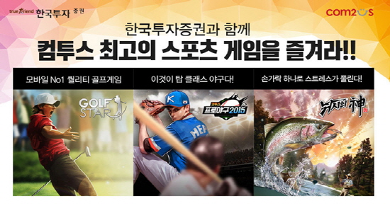 모바일 게임 기업 컴투스(대표 송병준)는 ㈜한국투자증권(대표이사 유상호)과 제휴를 맺고 자사의 인기 스포츠 게임 3종을 활용한 제휴 프로모션을 이달 31일까지 진행한다. 이번 제휴로 한국투자증권의 고객이 컴투스의 스포츠 게임을 이용할 경우 별도의 아이템 쿠폰을 선물로 받게 된다. 한국투자증권의 주 이용 고객층인 3040 세대가 즐겨 하는 컴투스의 대표 스포츠 게임 3종이 프로모션에 포함된다. 글로벌 누적 다운로드 3,000만 건을 돌파한 '낚시의 신', 사실감 넘치는 3D 리얼 모바일 골프 게임 '골프스타', 모바일 야구 게임의 최강자 '컴투스프로야구2015'가 그 대상이다. 한국투자증권 홈페이지와 모바일 금융상품거래 어플리케이션 '펀답', 홈트레이딩시스템에서 참여 및 내용 확인이 가능하다.