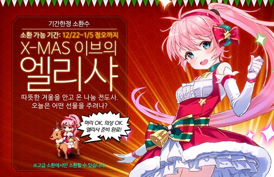 먼저, ‘소환사가 되고싶어’에서는 성탄절을 맞이하여 한정 소환수 ‘X-Mas 엘리샤’와 스페셜 이벤트 던전을 업데이트 한다. 이번에 공개된 ‘X-Mas 엘리샤’는 인기 스타를 꿈꾸고 있는 어여쁜 소녀 소환수로 속성에 관계없이 모든 유닛의 체력을 50% 상승시키는 강력한 스킬을 보유하고 있다. ‘X-Mas 엘리샤’는 오는 2016년 1월 5일까지 소환이 가능하며, 같은 기간 동안 엘리샤의 스토리 던전도 체험할 수 있다.