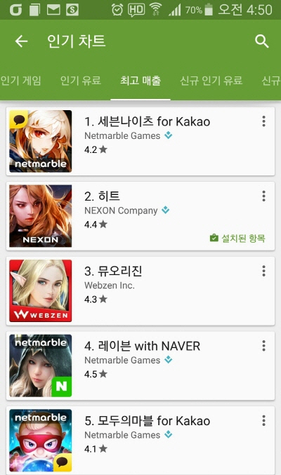 출시한지 2년이 다 된 ‘세븐나이츠’는 ‘1위 저격수’로도 유명하다. 2015년 2월 9일에도 ‘클래시오브클랜’을 끌어내리고 매출 1위에 오른 적이 있다. 다음날 ‘클래시오브클랜’은 다시 1위를 탈환했지만, 이후 3월까지 두 차례 ‘세븐나이츠’에게 1위를 뺏겼다.