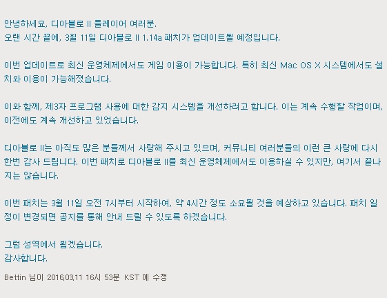 블리자드는 최근 배틀넷 홈페이지를 통해 ‘디아블로2’의 1.14a 패치를 적용한다고 밝혔다. Mac OS X 등 최신 운영체제에서도 게임을 구동할 수 있다는 점이 이번 업데이트의 골자다. 이번 패치에 이어, 블리자드는 외부 프로그램에 대한 감지 시스템도 개선할 예정이다.
