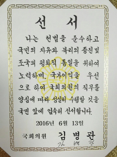 김병관 의원은 12일 자신의 페이스북을 통해 국회의원 선서를 공개하면서 의원의 직무를 성실히 하겠다는 의지를 밝혔다.
