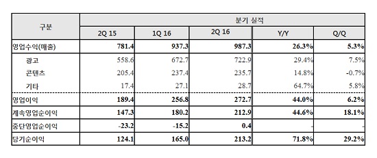 네이버는 2016년 2분기 매출(영업수익) 9,873억 원, 영업이익 2,727억 원, 당기순이익 2,132억 원의 실적을 달성했다고 밝혔다.