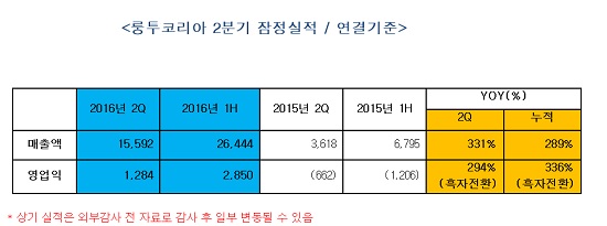 룽투코리아는 4일 잠정실적 공시를 통해 2분기 연결기준 매출액이 156억원을 달성해 지난해 동기대비 331% 급증했다고 밝혔다.