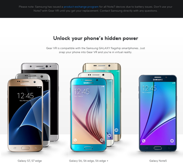 현재 기어VR의 지원 디바이스를 나열한 사진에도 ‘갤럭시S7-S7엣지-노트7’가 포함됐으나 밑의 설명에는 S7과 S7엣지, 두 제품의 이름만이 적혀있다.