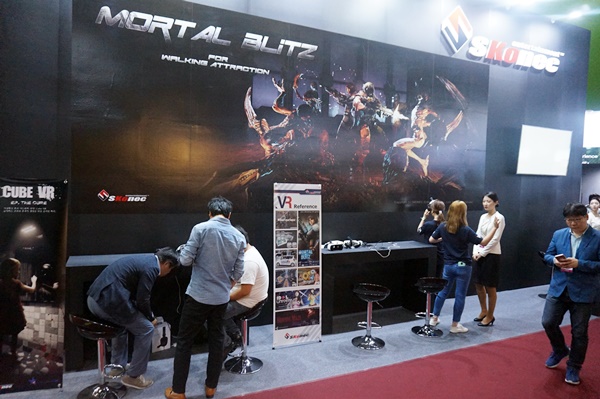 한국 최초 VR FPS게임 ‘모탈블리츠’로 유명해진 스코넥엔터테인먼트도 대형 부스에서 관람객들을 맞았다. ‘모탈블리츠’가 한국에서 처음으로 대중에게 공개되는 자리라 높은 관심을 모았으나, 전시회 첫날에는 네트워크 문제로 인해 게임을 시연하지 못해 아쉬움을 남겼다.