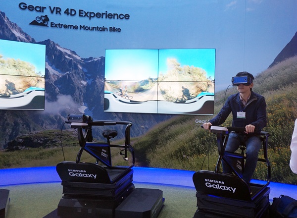 삼성전자는 기어VR을 활용한 2종의 어트랙션 ‘카약’과 ‘산악자전거’를 각각 4대씩 총 8대 설치했다. VR카메라인 기어360으로 촬영한 영상에 맞춰 어트랙션이 좌우로 흔들린다.
